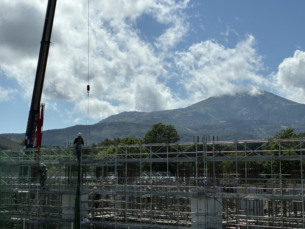 新駅予定地の東側から西方向に工事を見たアングルです。背後がニセコアンヌプリで、冬になるとパウダースノウ三昧が楽しめる国際リゾートニセコです。こんなに至近距離です。