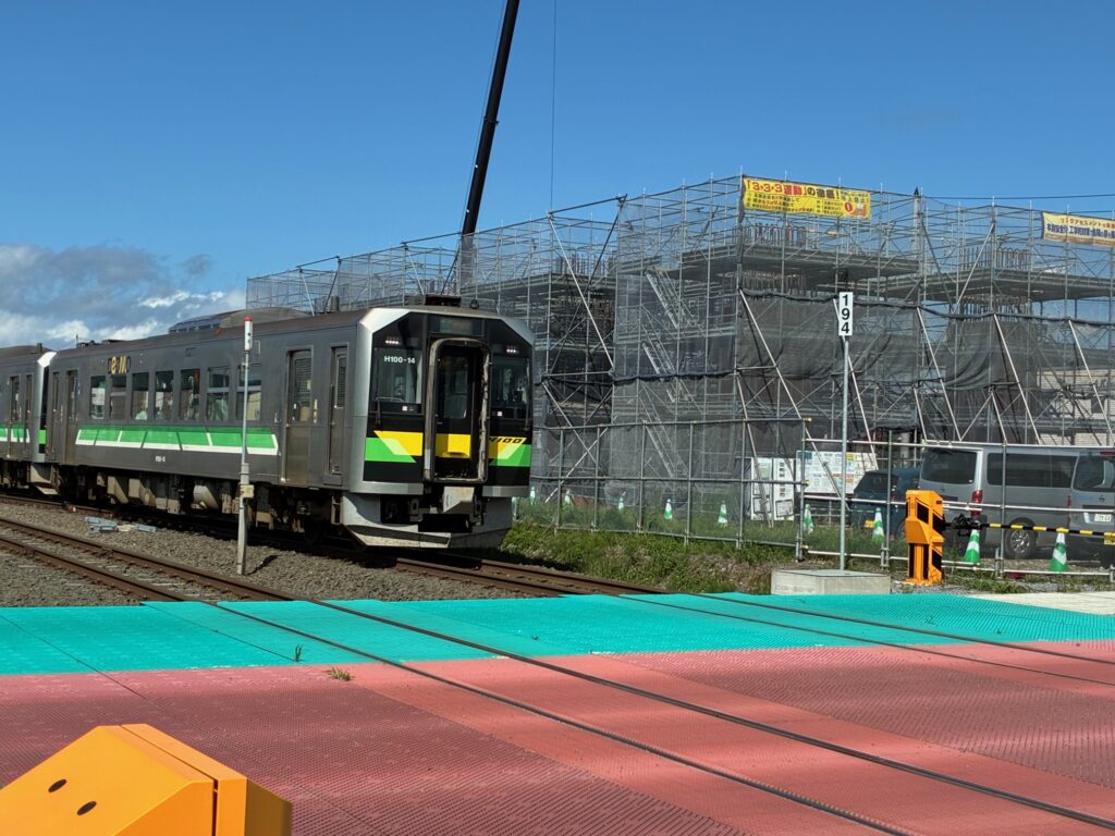 工事横の西側を在来線が通ります。小樽から倶知安駅に着く直前です。